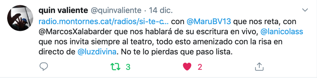 En esta última edición del año del programa “Si te cuento breve, dos veces cuento” de Quintín Valiente (@quinvaliente), que se transmite cada mes por @RadioMontornes, hablo sobre retos literarios en Twitter.
