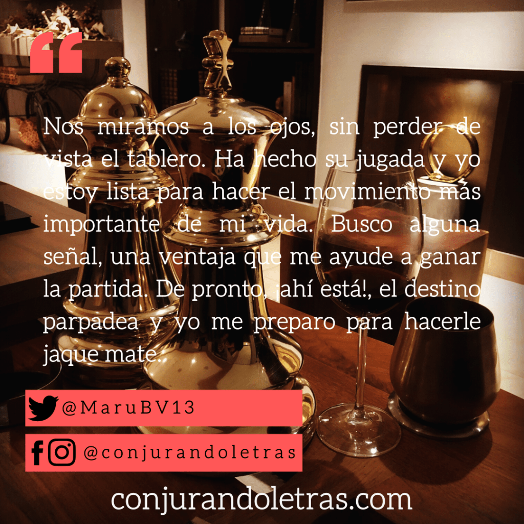 Nos miramos a los ojos, sin perder de vista el tablero. Ha hecho su jugada y yo estoy lista para hacer el movimiento más importante de mi vida. Busco alguna señal, una ventaja que me ayude a ganar la partida. De pronto, ¡ahí está!, el destino parpadea y yo me preparo para hacerle jaque mate.