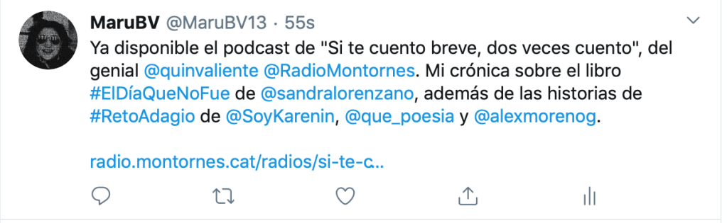 Ya disponible en línea, el podcast del programa del mes de marzo de «Si te cuento breve, dos veces cuento», del genial Quintín Valiente (@quinvaliente) @RadioMontornes. Ahí mi crónica sobre el libro «El día que no fue» de @sandralorenzano, además de las historias de #RetoAdagio de @SoyKarenin, @que_poesia y @alexmorenog.