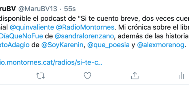 Ya disponible en línea, el podcast del programa del mes de marzo de "Si te cuento breve, dos veces cuento", del genial Quintín Valiente (@quinvaliente) @RadioMontornes. Ahí mi crónica sobre el libro "El día que no fue" de @sandralorenzano, además de las historias de #RetoAdagio de @SoyKarenin, @que_poesia y @alexmorenog. Puedes escuchar aquí el podcast. … Sigue leyendo Crónica «El día que no fue»*