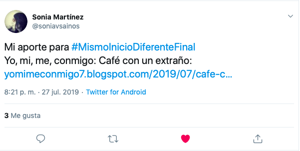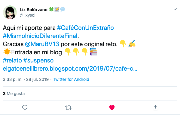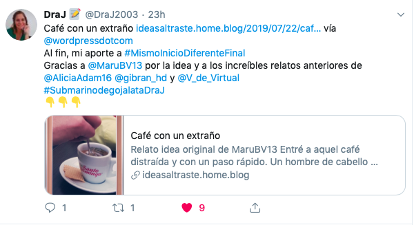 Gracias! Tengo que decir que disfruté mucho el proceso, desde aquel café y la charla con Alicia donde surgió la idea. Ha sido maravilloso ir descubriendo las historias que se han construido. Muy pronto tendremos nuevo reto #MismoInicioDiferenteFinal por @AliciaAdam16 y @MaruBV13
