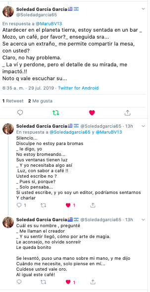 En julio de 2019, mientras @AliciaAdam16 y yo conversábamos, yo observaba a un hombre de cabello blanco garabatear en una libreta. Esa imagen se convirtió en una idea…ambas escribiríamos una historia con #MismoInicioDiferenteFinal. Sorprendentemente más amigos se sumaron de manera espontánea. ¡Bienvenidos a la colección de historias!